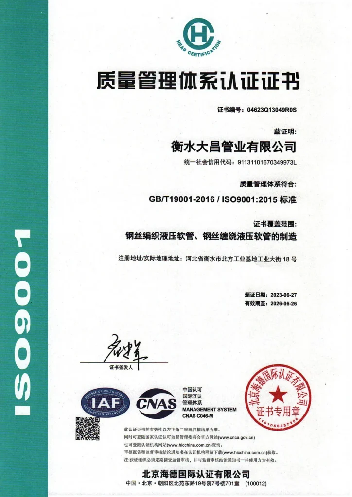 ООО «Хэншуй Дачан Трубная Индустрия» является специализированным производителем гибких шлангов и шланговых сборок для гидравлических стоек. Компания была основана 24 января 2008 года с уставным капиталом в 55,8 млн юаней и насчитывает около 100 сотрудников.